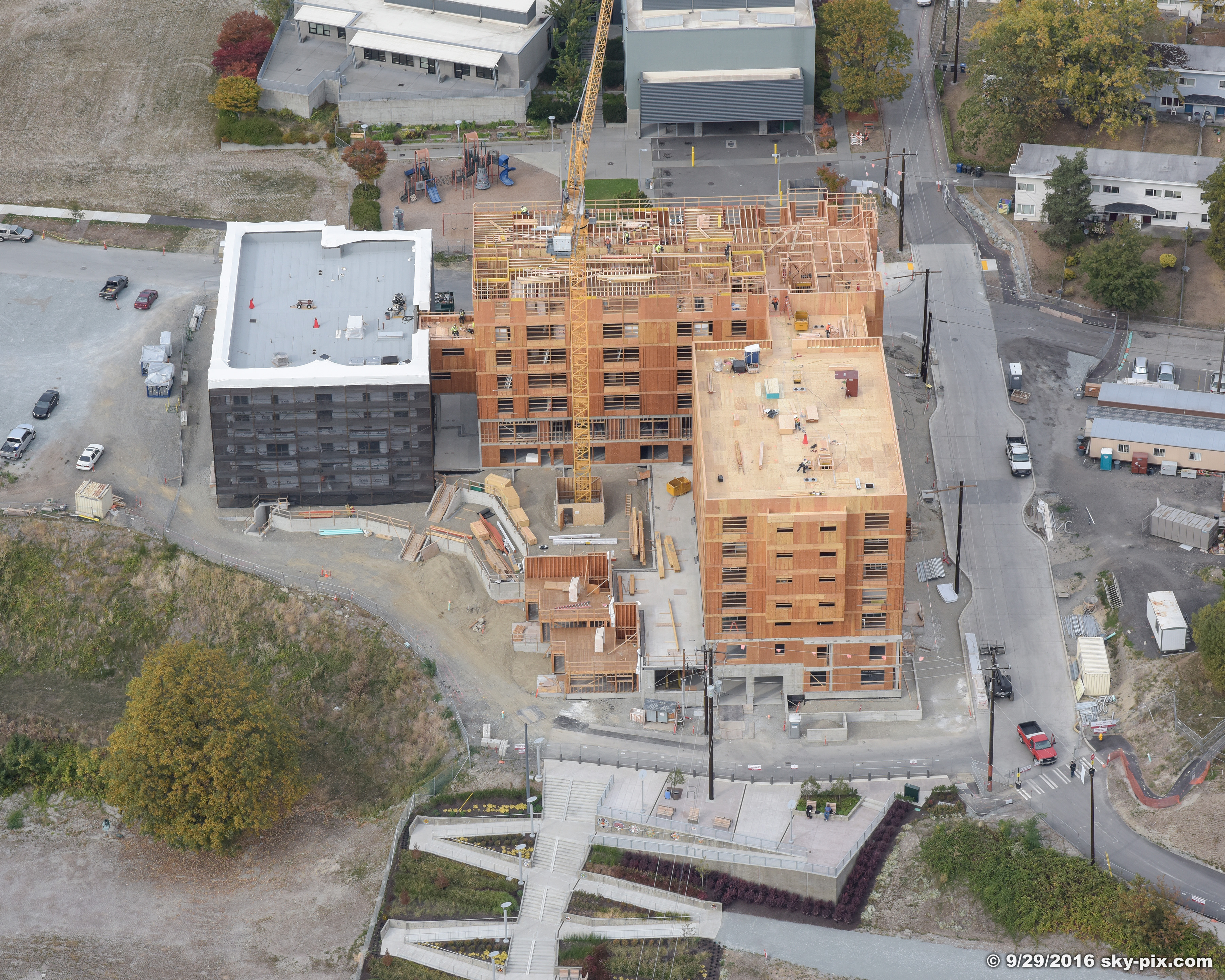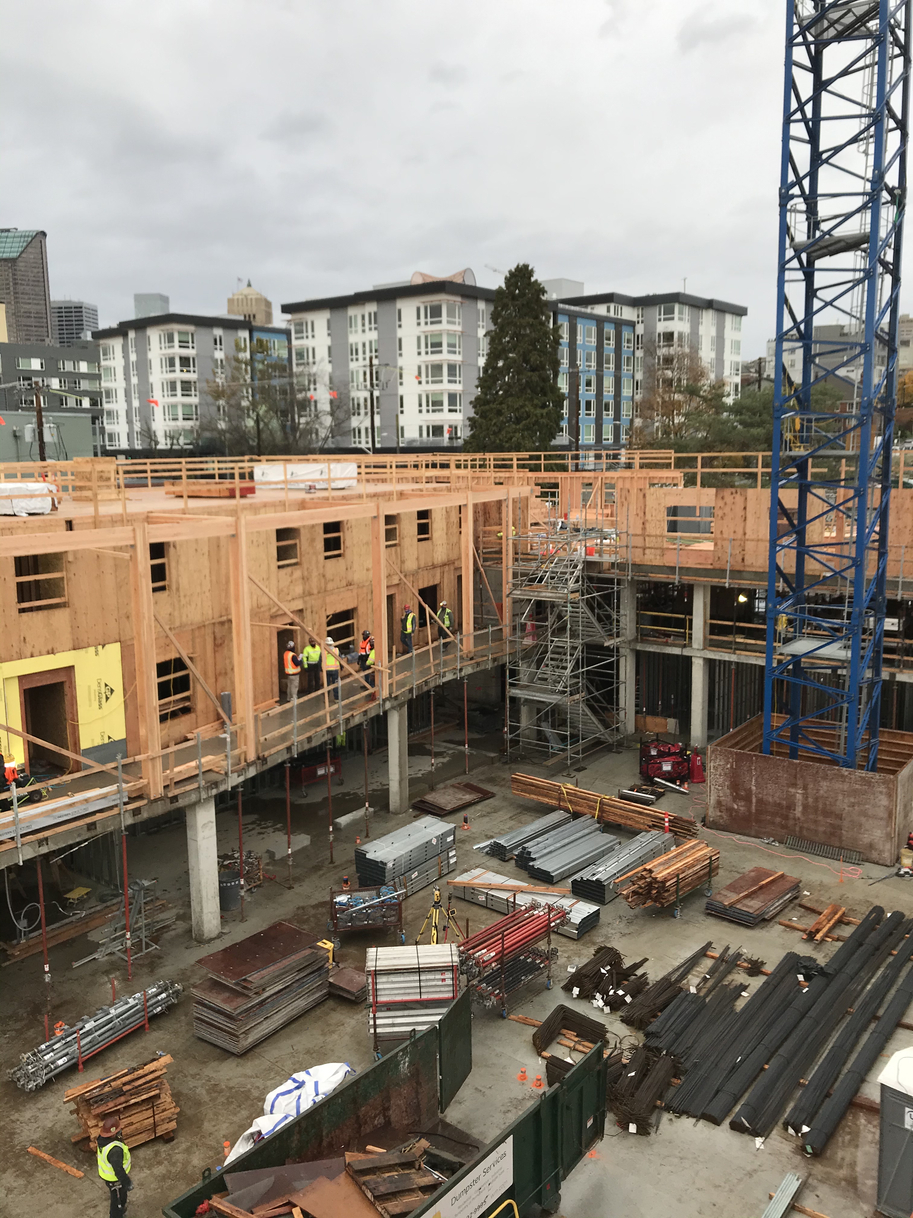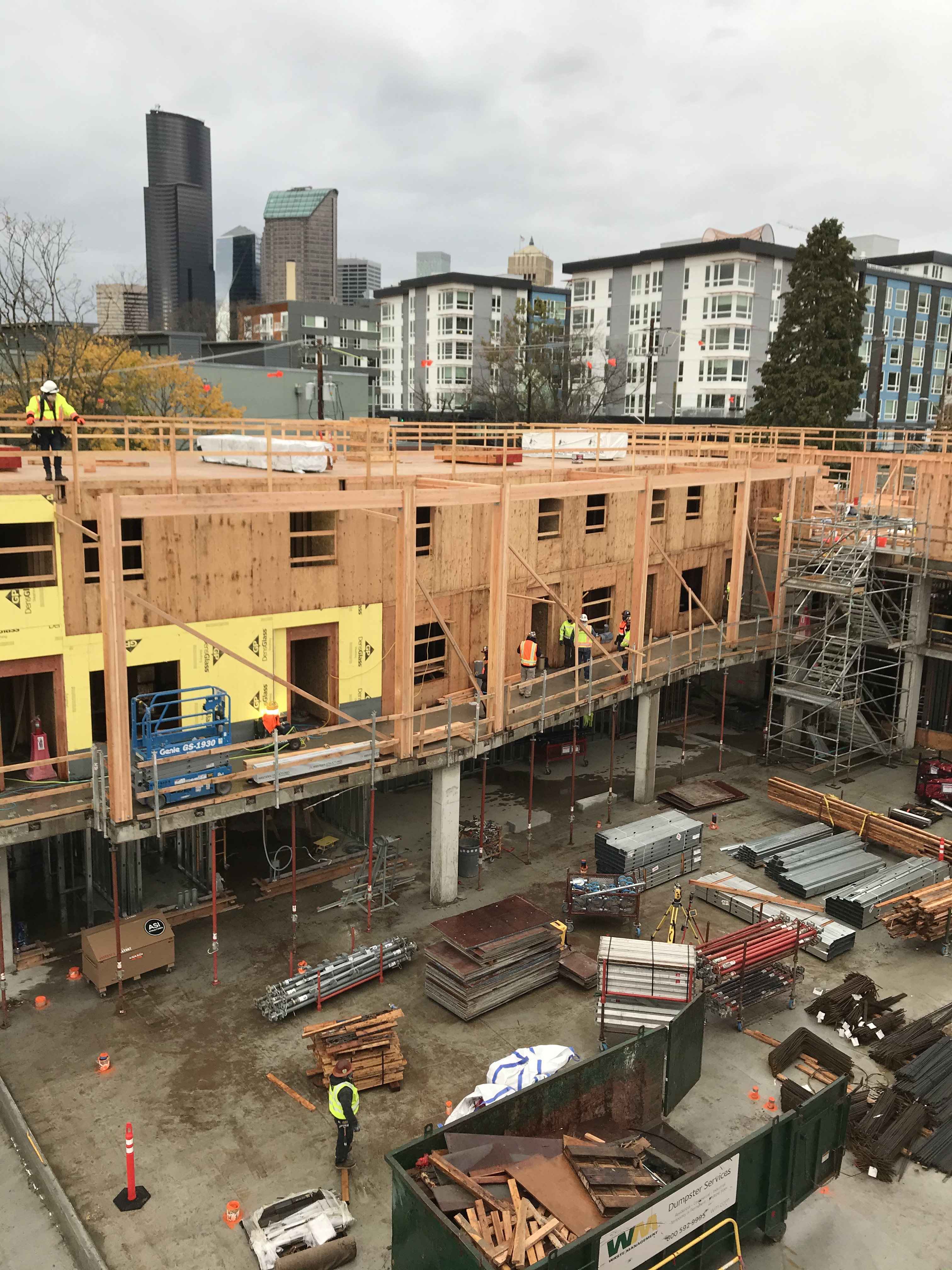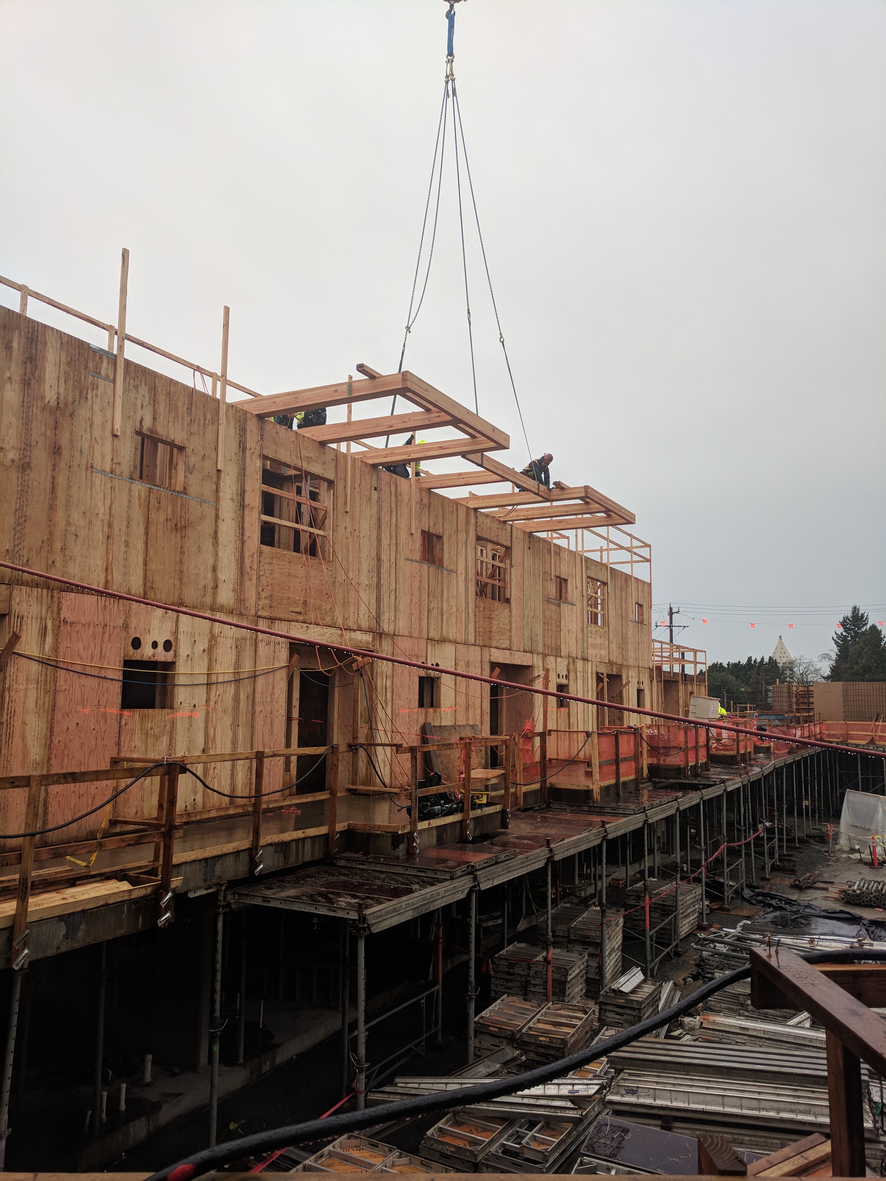 The Hinoki apartment project is a 3 building apartment project located in Yesler Terrace in Seattle, WA. This project is for Seattle Housing Authority through Anderson Construction. This project is unique in that the General Contractor (Anderson) was able to rent the adjacent lot to allow us to panelize the walls across the street and crane them over (panelized walls shown in second photo).