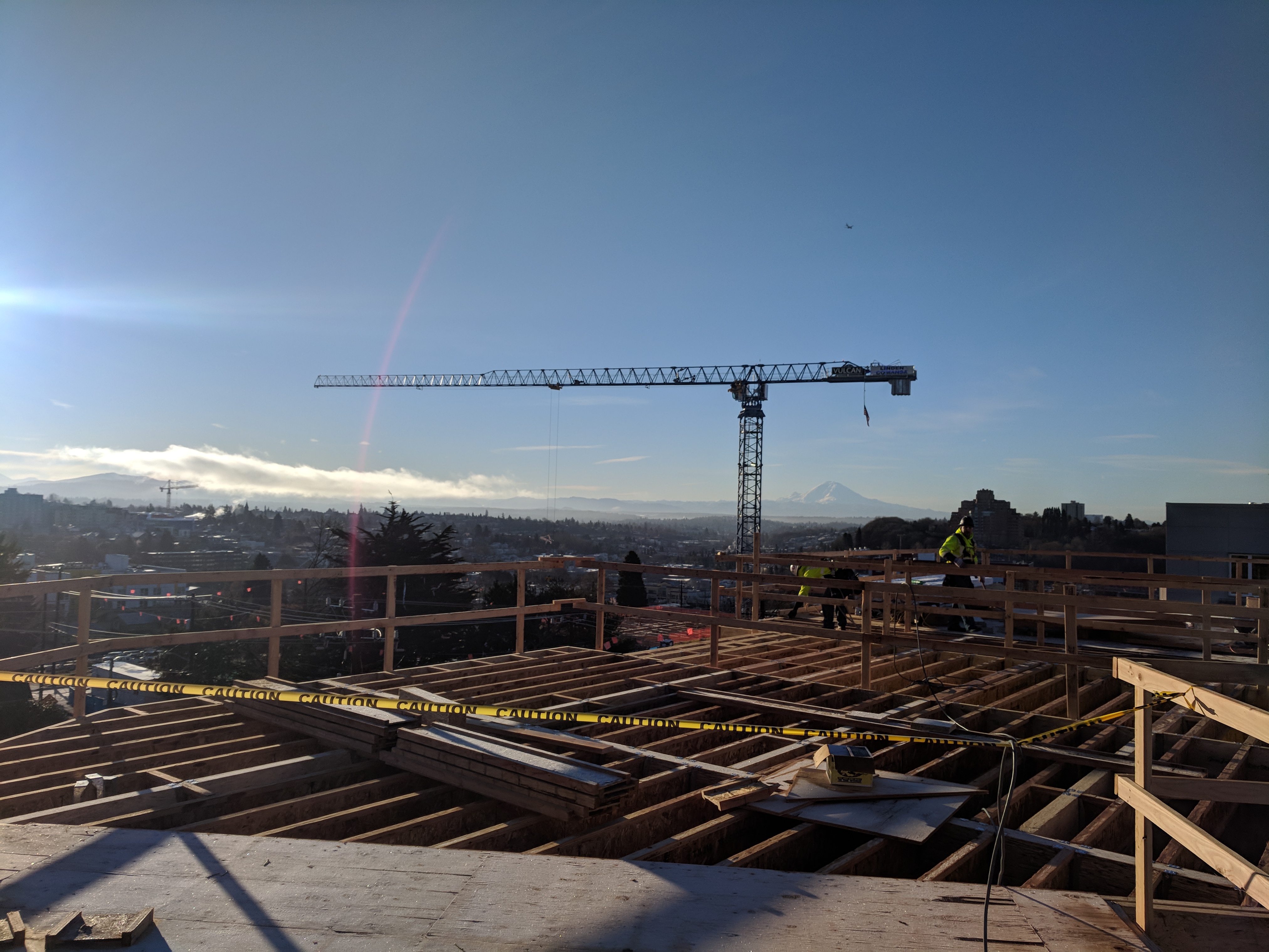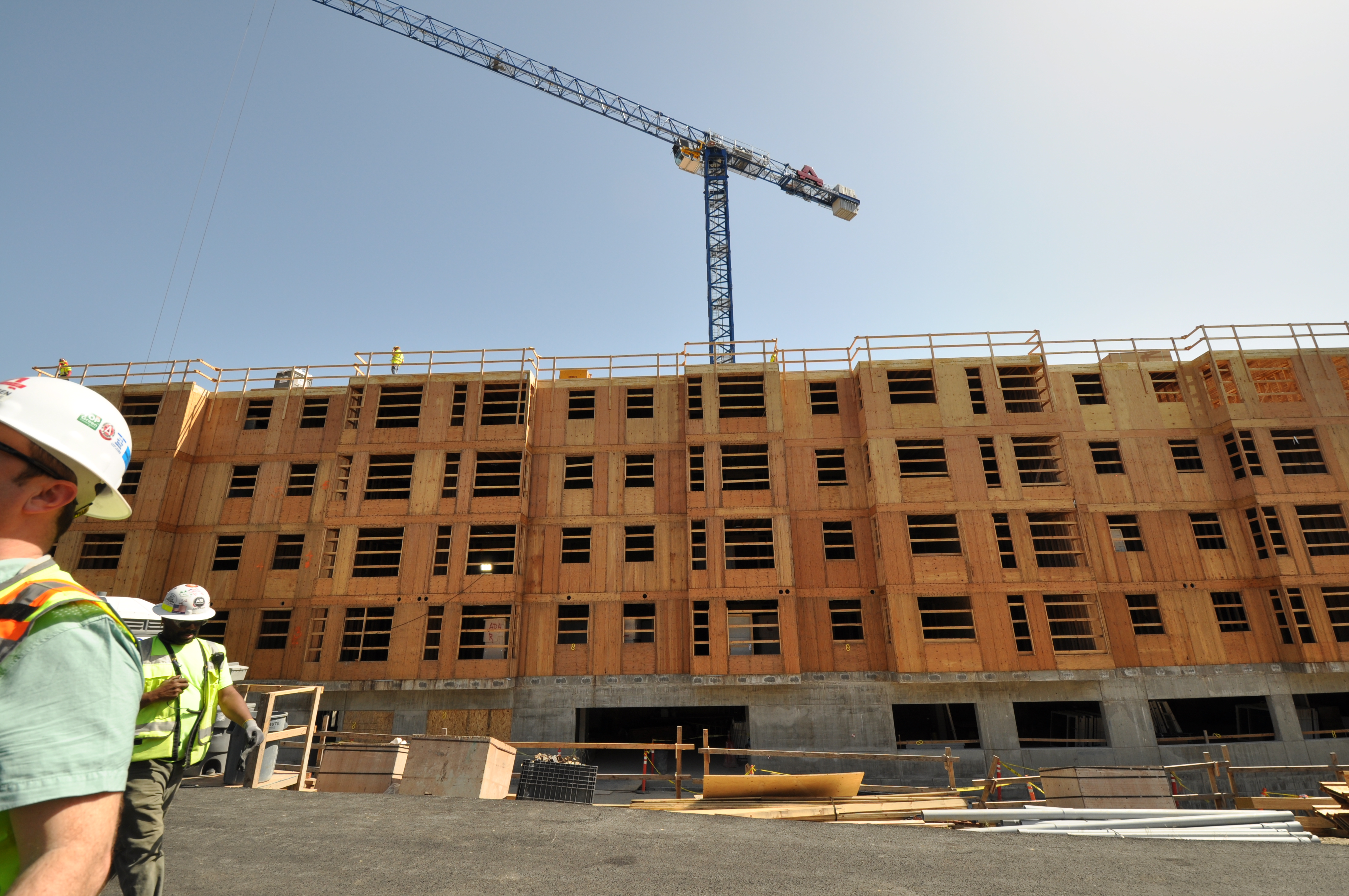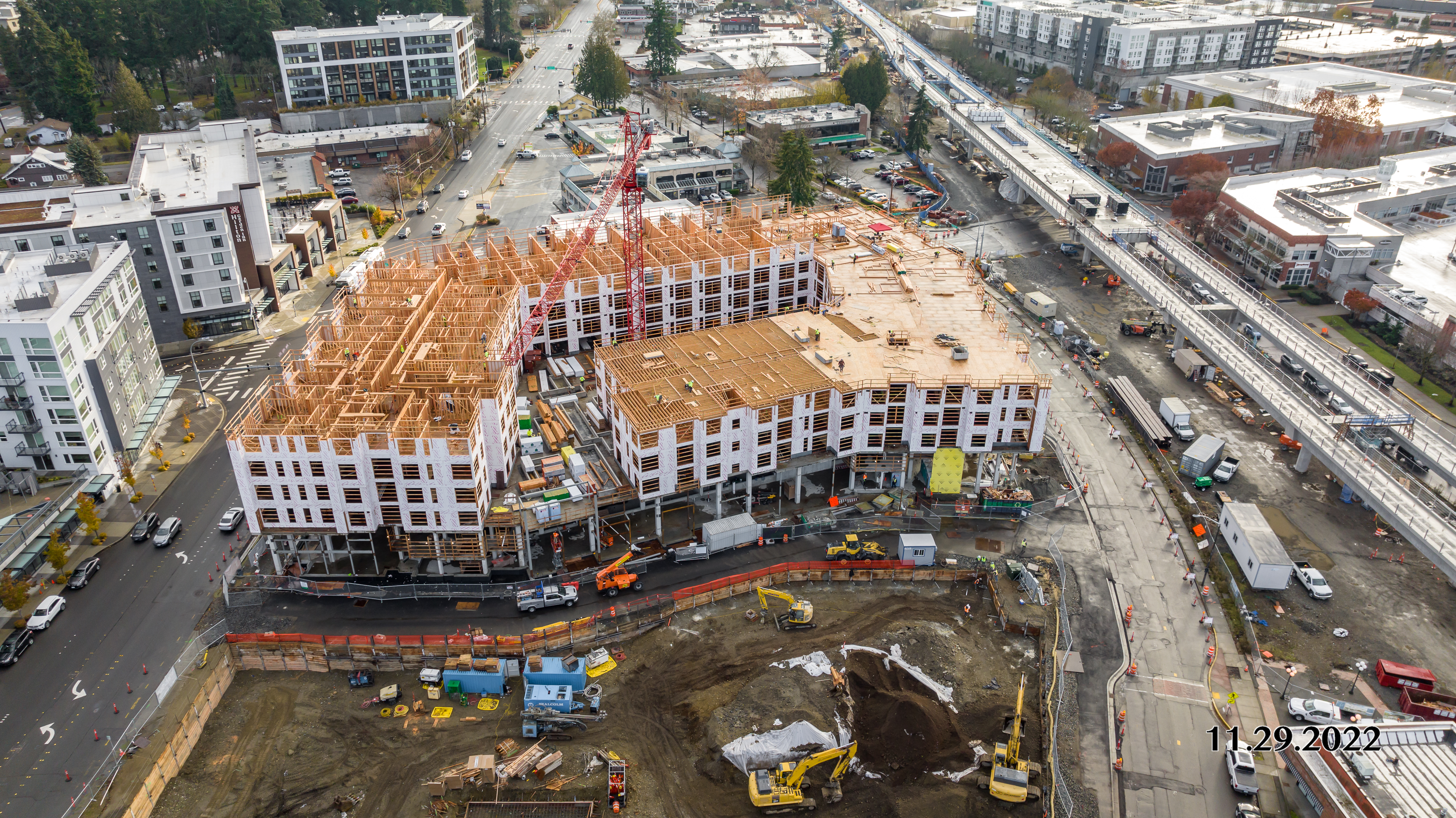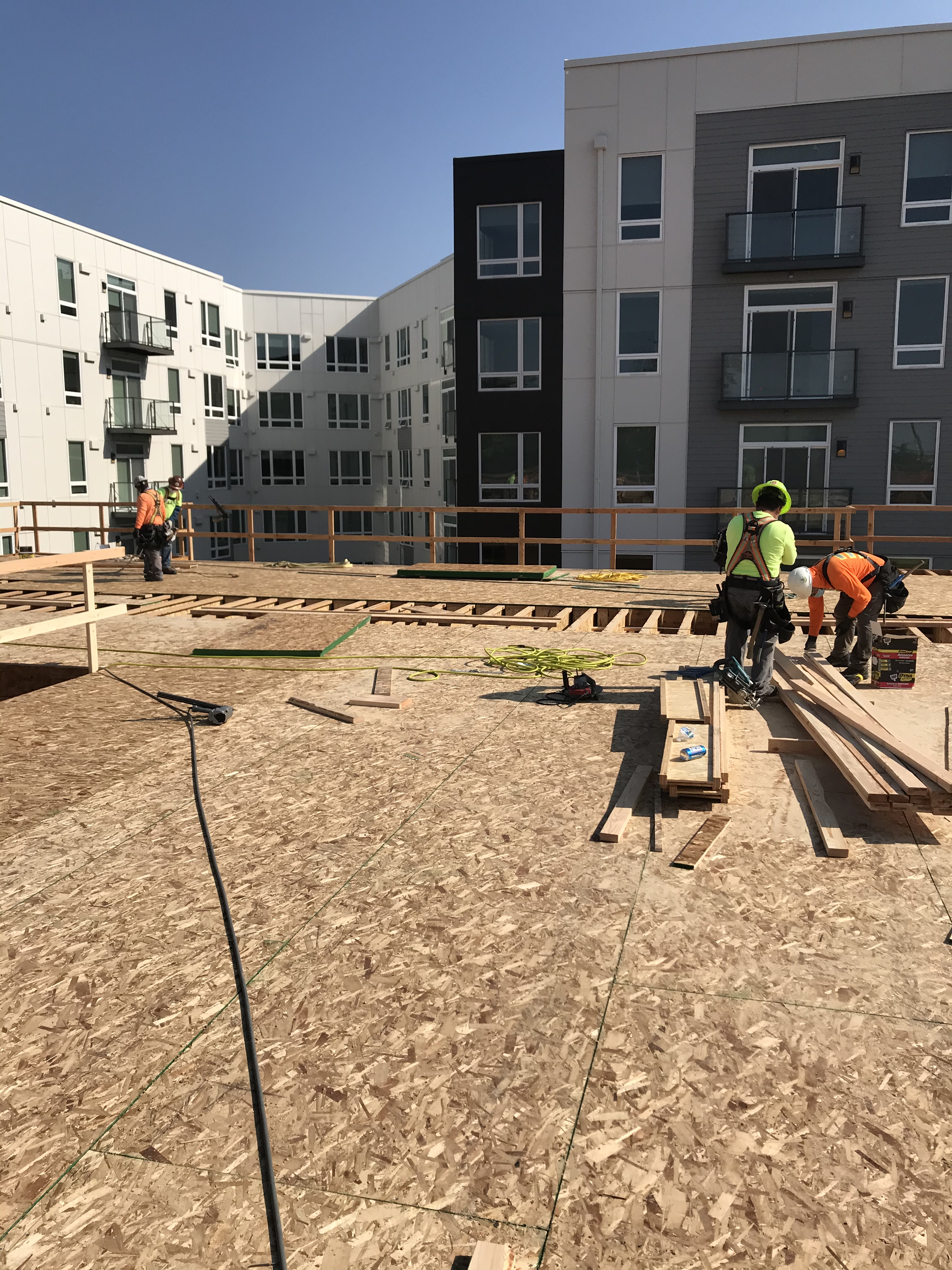 The Hinoki apartment project is a 3 building apartment project located in Yesler Terrace in Seattle, WA. This project is for Seattle Housing Authority through Anderson Construction. This project is unique in that the General Contractor (Anderson) was able to rent the adjacent lot to allow us to panelize the walls across the street and crane them over (panelized walls shown in second photo).
